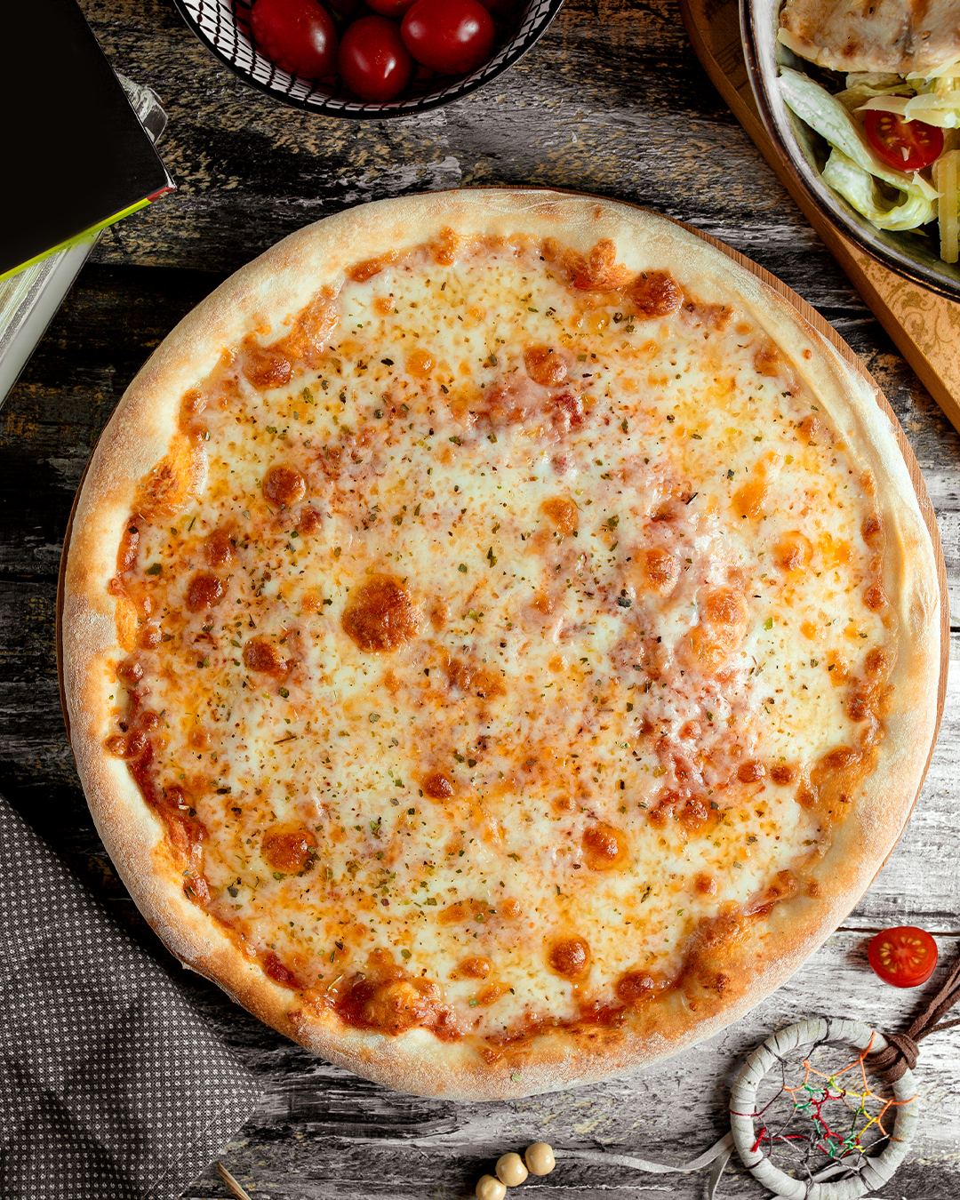 fresh mozzarella, turkey, rocket, olives parmesan flakes, mix cheese, fresh tomato,olive oil, basil