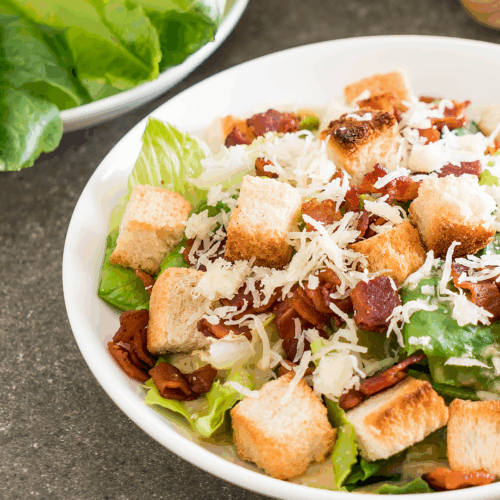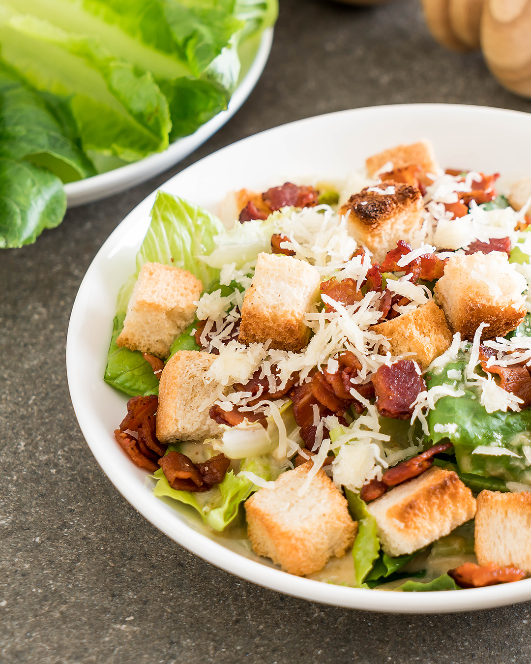 lettuce, chicken mix (cooked with olive oil chicken cream, white wine, onion and mushrooms), bacon, parmesan flakes croutons