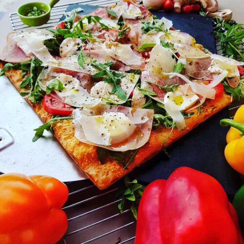 fresh mozzarella, prosciutto, rocket basil, parmesan flakes, mix cheese fresh tomato, olive oil